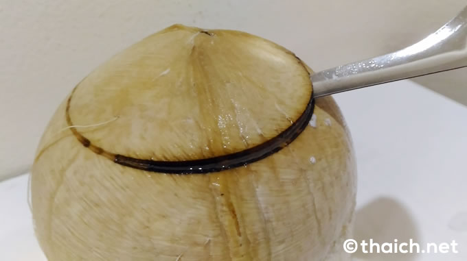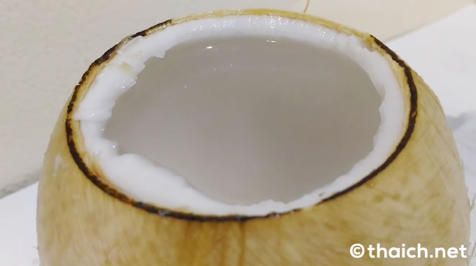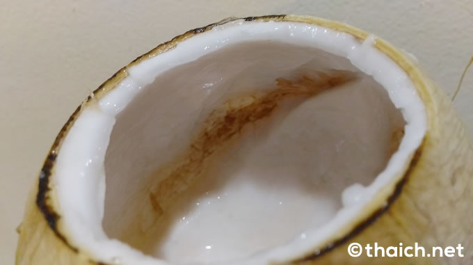 蓋をあけるとなみなみとココナッツジュースが入っています。セットについているストローを使っていただきます。これはまわりの殻を焼いて中のジュースを煮詰めた「มะพร้าวเผา(マプラーオパオ)」なので、とっても甘くて美味しいです。(参照 大きなココナッツと小さなココナッツ、2つのココナッツの違いとは?)