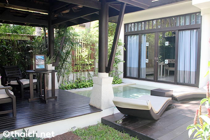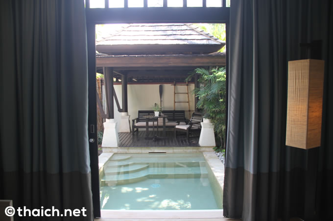 さらに前に進んでいくと、なんと目の前にプールが!そうです、「プールヴィラ」というくらいですから、プライベートプールが付いた部屋なんです。しかもここは外からは中が見えないようになっている完全プライベート空間。開放的に青空の下で、裸で泳いだっていいんです!