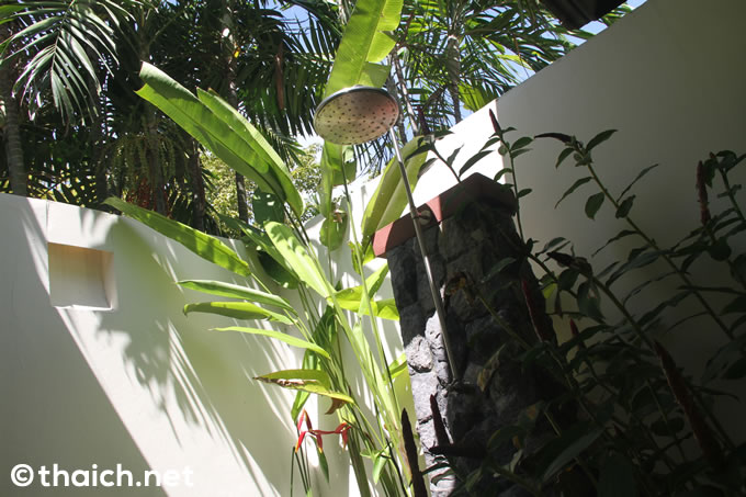バスルームの右手はシャワー室なのですが、その奥の扉を開けると、なんと屋外シャワー!青空の下でシャワーを!