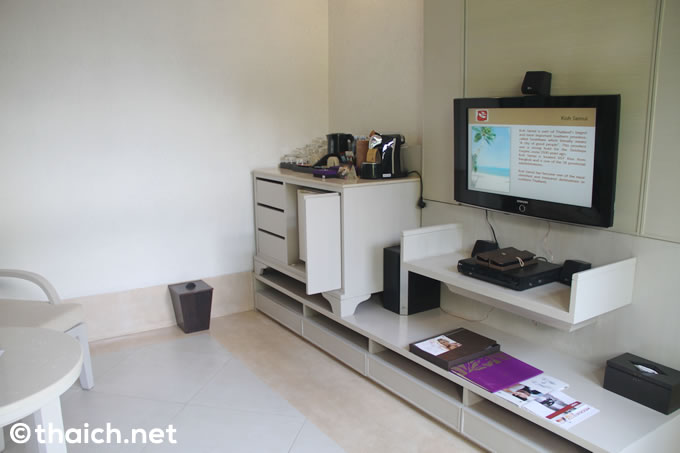 大きなテレビにDVDプレイヤー、ミニバーがあります。