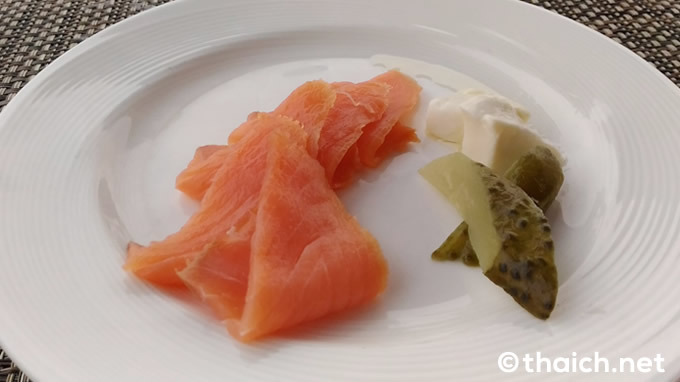 和食コーナーにあったのでお刺身と勘違いしたスモークサーモン(笑)そしてチーズとピクルス。