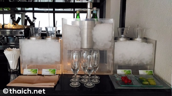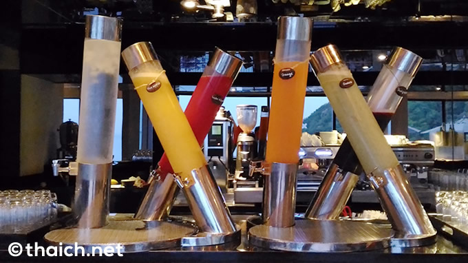 テラス席からバイキングのあるレストラン内に入ると、目の前にあるこれがフルーツジュースにお水。