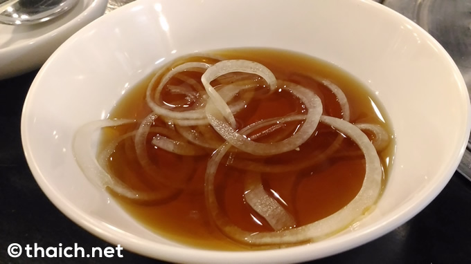 生の玉ねぎの入ったスープにつけてお肉を食べるのが「オンマサラン」流。