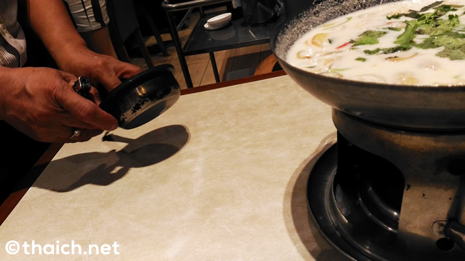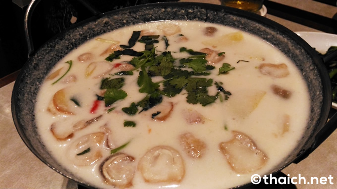 スープはココナッツミルクの鶏のスープ「トムカーガイ」(小130バーツ/大160バーツ)。