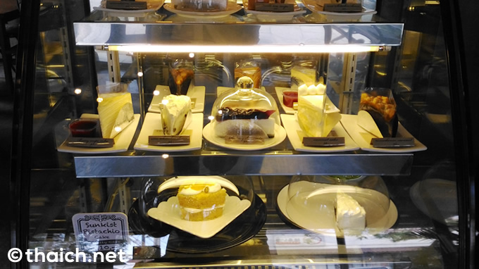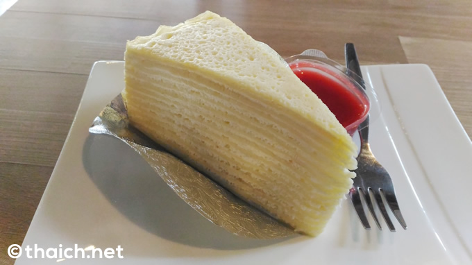 お店に入ると正面にケーキのショーケースがあって、とっても美味しそうです。お腹はいっぱいでしたがスイーツは別腹(笑)。90バーツの「ベリークレープケーキ(Berry crepe cake)」と、コーヒーをオーダーです。