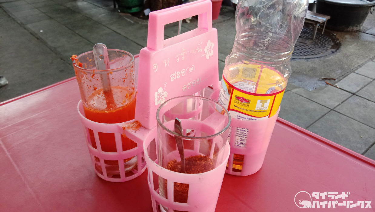 テーブルにはお決まりの調味料セット。ナンプラー、砂糖、唐辛子、そして辛くしたお酢です。朝から辛いものはちょっと・・・というのと、スープはしっかり味がついて、それだけで十分に美味しいので、何も入れませんでした。でも周りのタイ人客は、ガンガン唐辛子を入れていましたよ。辛さで朝の眠気を吹き飛ばすのでしょうか(笑)。