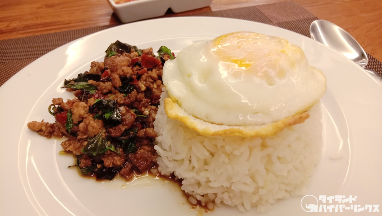 目玉焼き付きのガパオライスは100バーツほどだったと思います。美味しかったです。
