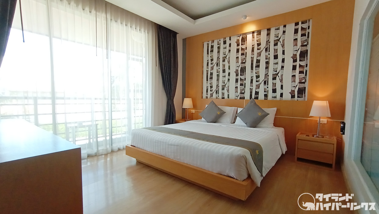 こちらが室内。大きなベッドに、電気スタンド、大きな窓。右手に少し見えるのはバスルームです。