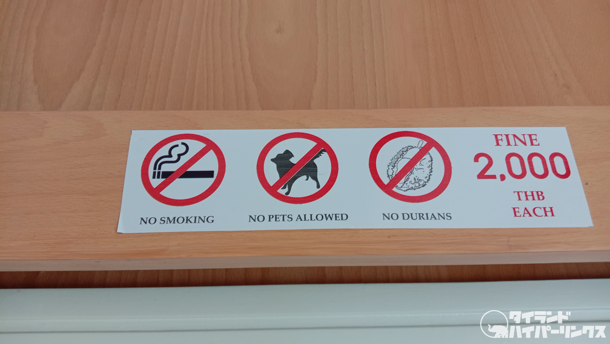 喫煙、ペットの連れ込み、ドリアンの持ち込みは罰金2000バーツです。