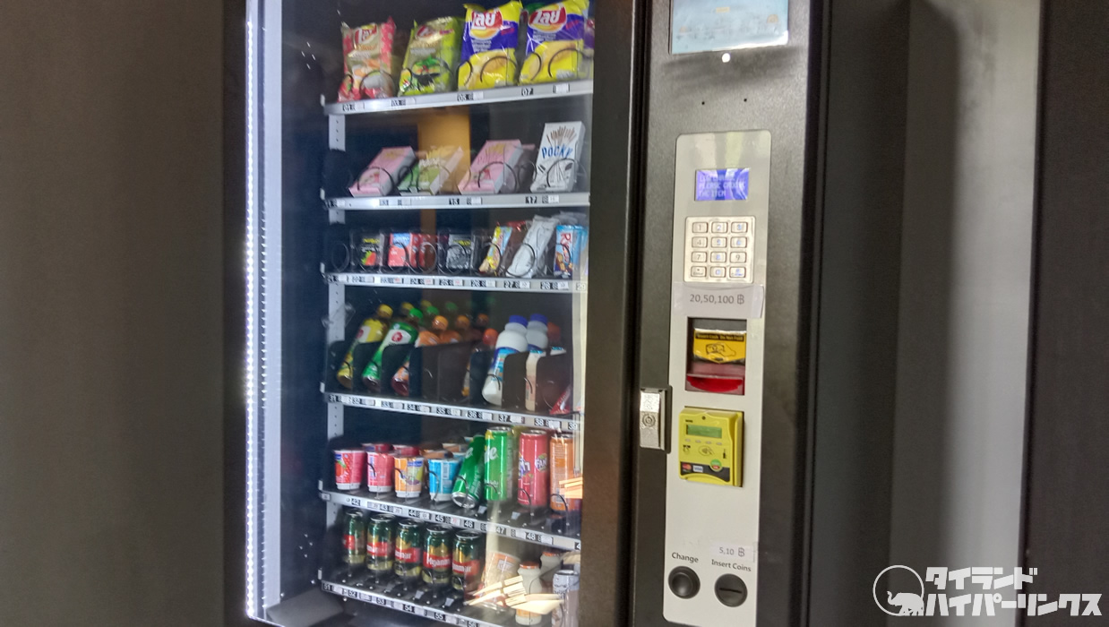 自動ドアの抜けるとそこには自動販売機。タイバーツが使えます。ただし炭酸ジュースの購入には注意を。落下式なので、蓋を開けると炭酸が吹き出しますよ(笑)