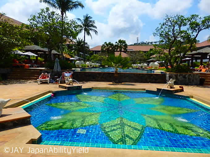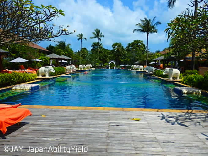 まずはプールから。プールは2カ所にあり、一つはホテルの真ん中に位置する大きなメインプール。長さは40m程あり、プールサイドには鼻から水を出している象さんが!