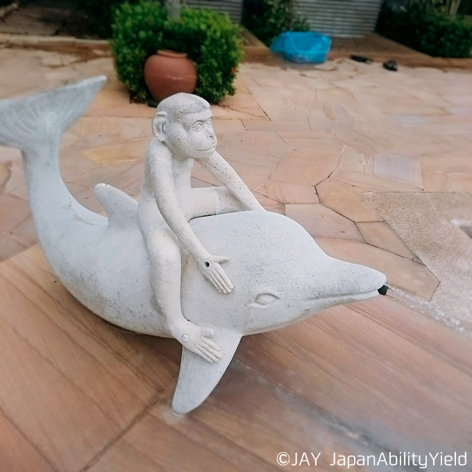 メインプールの横には浅いキッズプールがあるので、小さなお子様連れにもとても過ごしやすい造りになっています。そしてキッズプールにはイルカに乗ったお猿さんが・・・。