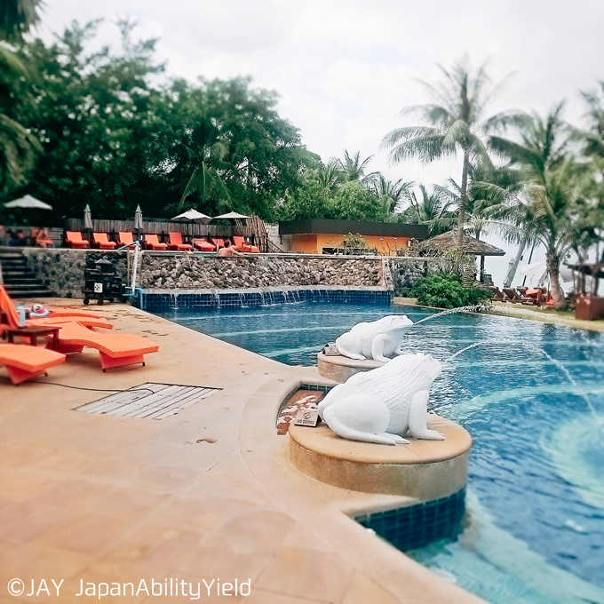 さらに奥に進んだビーチ側にもプールがあり、こちらは上段、下段に分かれ、海を眺めながら泳ぐことができます。比較的小さめですが、静かに過ごしたい方はこちらが良いかもしれませんね。そしてこちらにはカエルさんがいました(笑)。