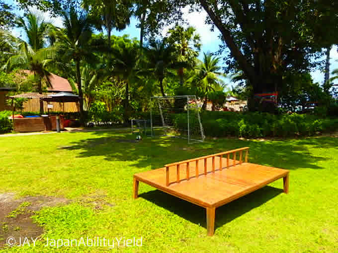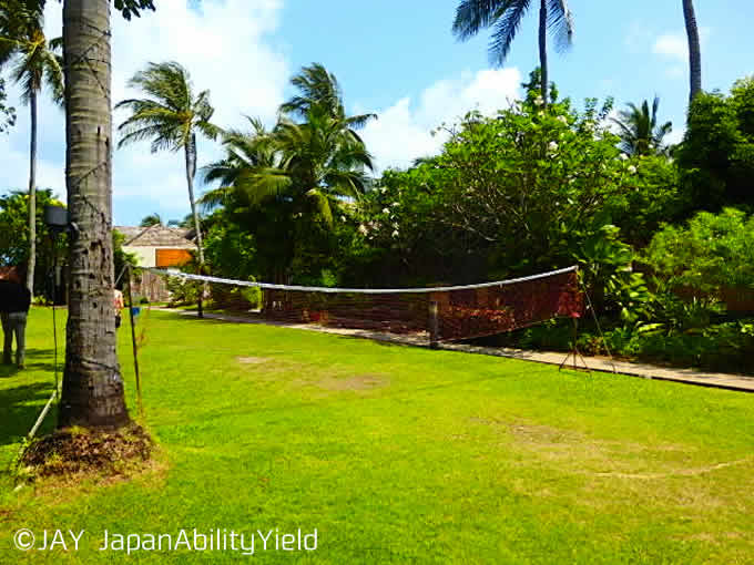 メインプールとビーチの間には広々と遊べるガーデンがあります。ネットが張ってあり、タイの伝統スポーツであるセパタクロー用でしょうか?その横にはサッカーゴールもあるので、ミニゲームも楽しめそうです。