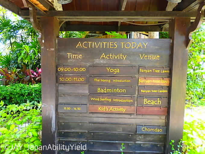 ヨガやムエタイ(タイボクシング)、ウィンドサーフィンなど、色々とアクティビティも用意されているので、上手に利用してみると充実したホテルライフを過ごせそうですね。