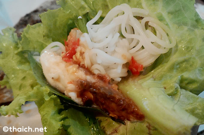 日本人からすると、焼き魚に生野菜ってどうするの?と思うでしょうが、生野菜と一緒にプラーニンをいただくのがタイ式。プラーニン、カノムチン、ハーブをレタスや白菜で巻いて食べるんです。お肉やお米をサンチュで巻いて食べる韓国式の焼き肉のような感じですね。