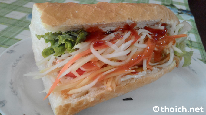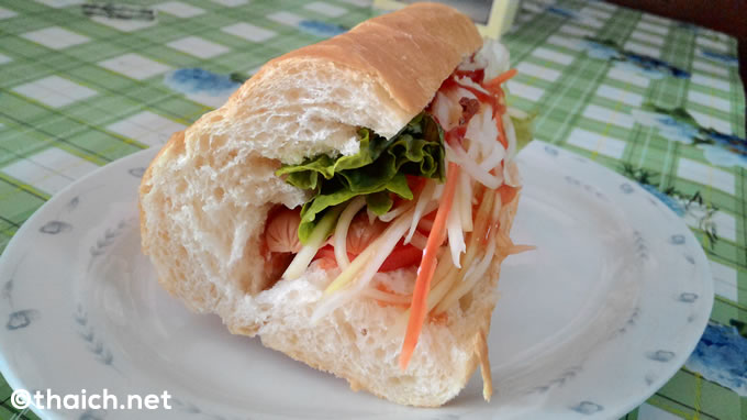 このお店ではおばちゃんがサンドイッチを作る前に、フランスパンを炭火で焼いていました。だからパンは温かくてサクサクです。具材はソーセージとチーズとレタスとトマトとニンジンとパパイヤ。青パパイヤはソムタム(パパイヤサラダ)にするように青パパイヤを千切りにしてあります。こがシャキシャキとした歯ざわりで、サンドイッチがますます美味しくなります!