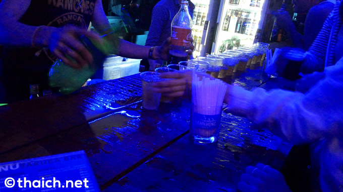 こちらが無料で提供されるお酒です。入店してすぐ右側にあるカウンターにずらりと並べたプラスチックのグラスにウイスキーをどぼどぼ入れて、コーラかスプライトを選んで割ってもらいます。この日は週末だったので、タイから訪れたのタイ人観光客も多く、お店の中に入りきれないほど超満員でした。