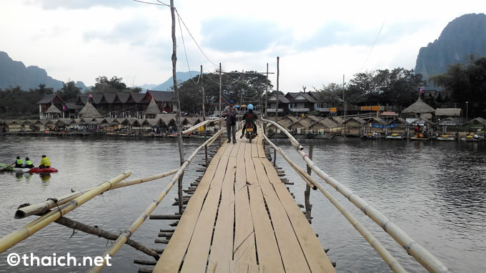 これはバンビエンを流れるナムソン川に掛かる橋。川向うには水上のレストランやバンガローが。今後ますます開発が進みそうです。