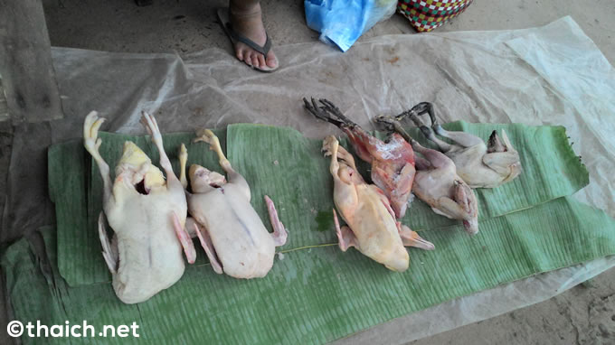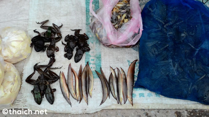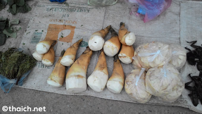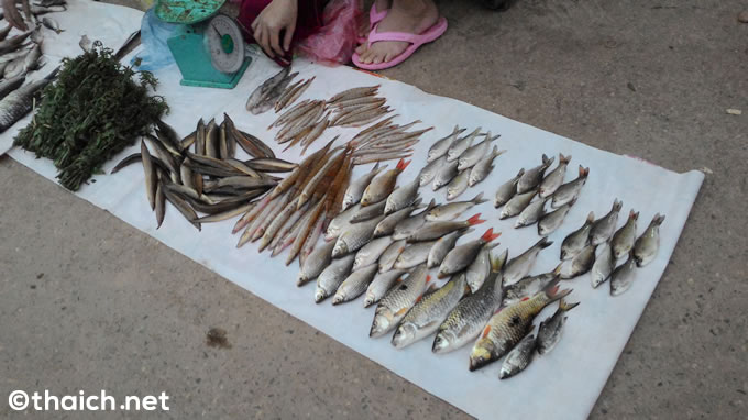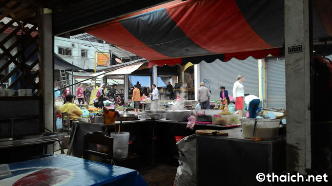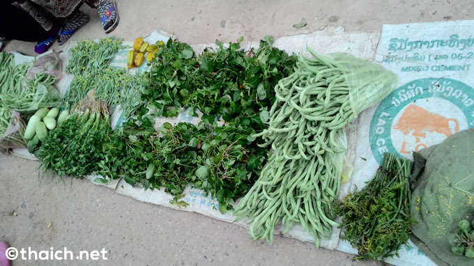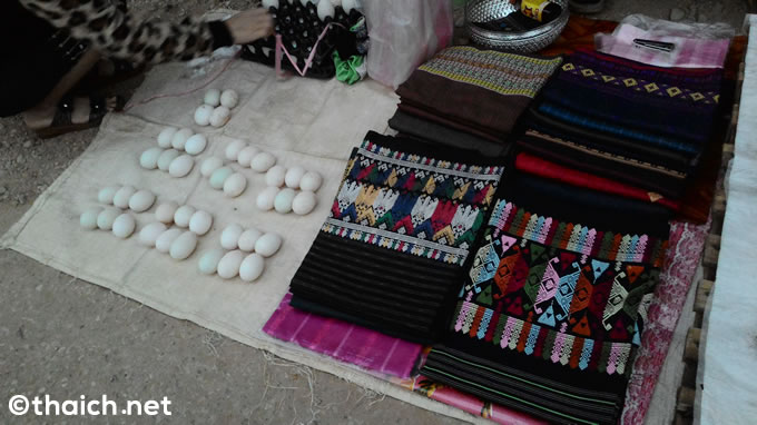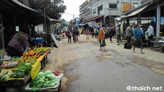 こちらは早朝7時頃の朝市の様子。多くのお店が道路にシートを敷いて、商品を並べる方式です。