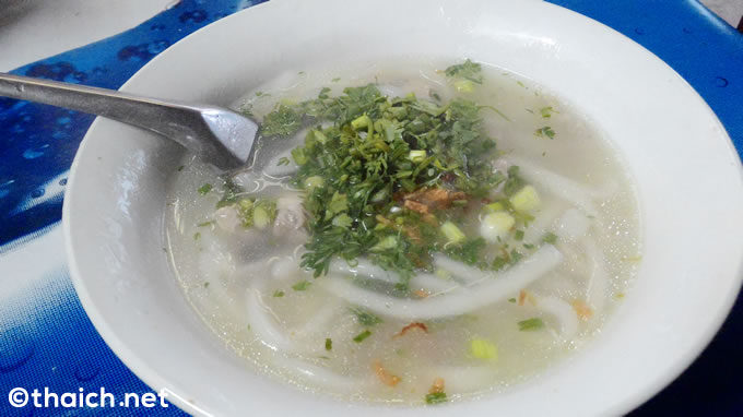 朝市の横の食堂で朝食。ラオスうどん”カオピヤック”が1万キープ(約140円)。