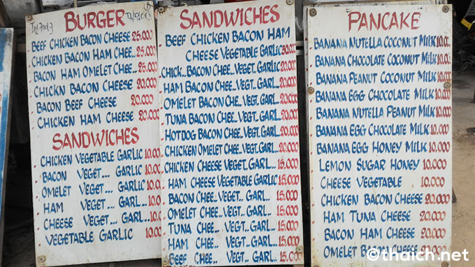 あちこちに点在するサンドイッチやロティ(パンケーキ)を売っている屋台のメニューです。