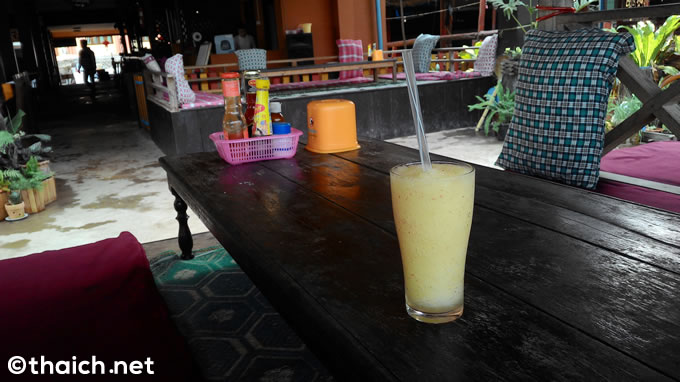 フルーツシェイク。お座敷のレストランで休憩。リンゴ、マンゴー、スイカ、パパイヤ、パイナップル、バナナなどなど、たくさん種類があります。