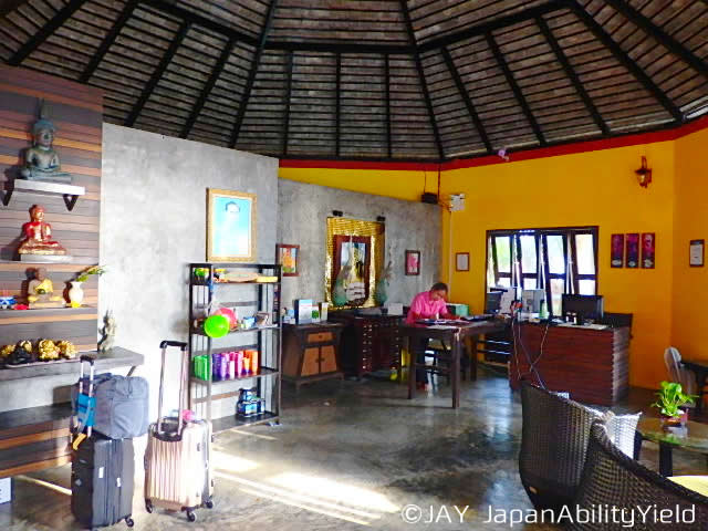 まずはチェックインをするためにレセプションへ。天井が高いため風通しも良く、南国情緒溢れる造りになっていました。