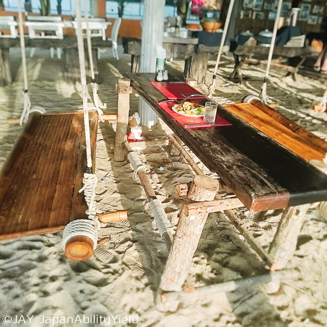 朝食はビーチに立てられたレストランでいただきます。イスもブランコになっており、机の下にいたワンちゃんも気持ちがよさそう。苦労して来たビーチなだけに、天国にいるような、穏やかで幸せな気分になり、「秘密のビーチ」と呼ばれるのも納得です。