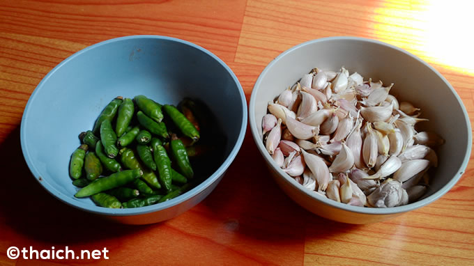 こちらはテーブルに置いてある、唐辛子とニンニク。これらを生でボリボリとかじりながら「カオカームー」を食べ進めるのがタイ式です。この小さなニンニクは皮ごと食べてしまってください。