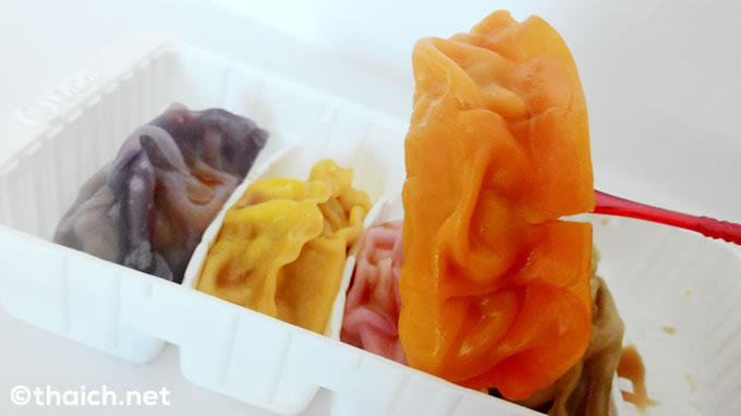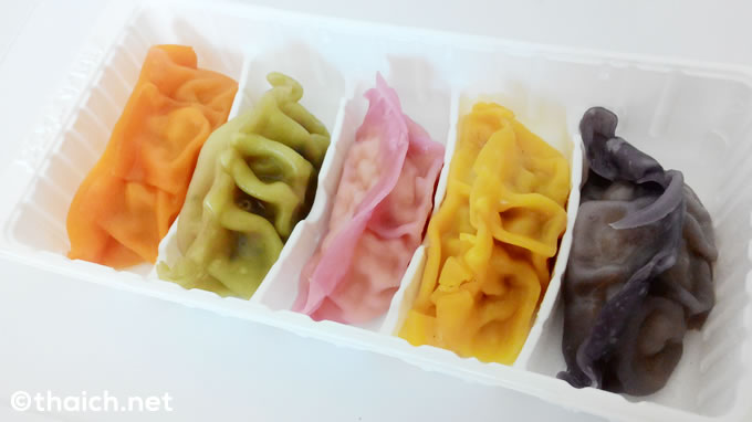 この餃子の特徴はなんといっても、5個入りで5個とも色も味も違うということ。セブンイレブンでは何種類かの餃子が並んでいますが(タイ人餃子好きなんですね)、いちばん目に止まるのがこれです。早速購入し(37バーツ、約115円)、温めてもらって持ち帰って食べてみました。