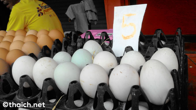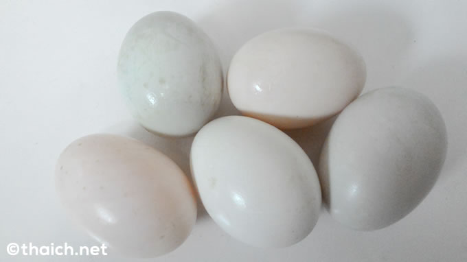 売られていた2種類のタマゴ。一つが普通のニワトリのタマゴで、もう一つがアヒルのタマゴ。上の写真では左の茶色い方がニワトリのタマゴで、白いほうがアヒルのタマゴです。どれも一つ5バーツ(約16円)だったので、アヒルのタマゴを買ってみました。