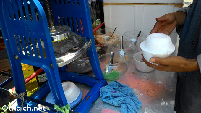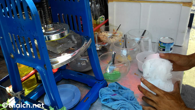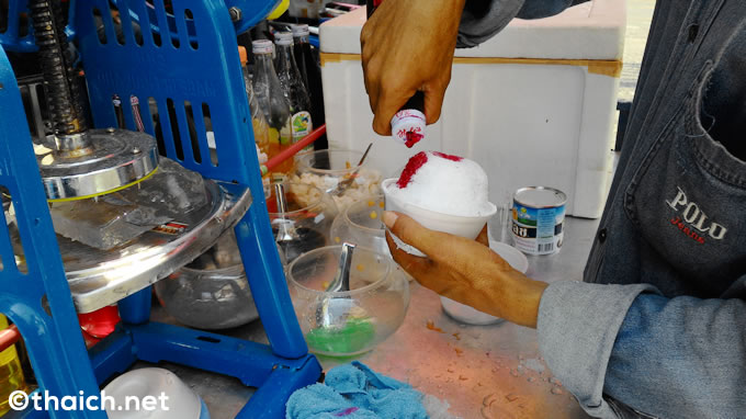 シロップをかけたら、その上に練乳もタップリ。これでタイ式のカキ氷・ナムケーンサイ(น้ำแข็งไส)の出来上がり。