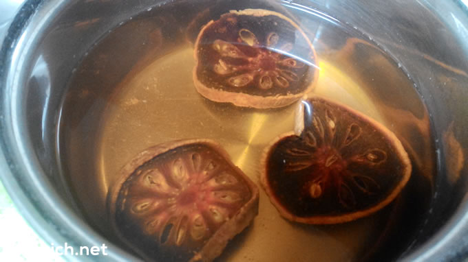 これを煮出すだけで出来上がり。とっても簡単ですね。最初にマトゥームを炙ると香りがより良くなるそうですが、省きました。水1リットルで1枚としているレシピもありました。