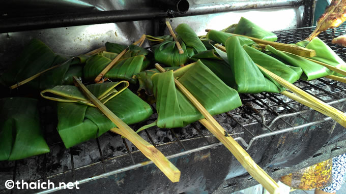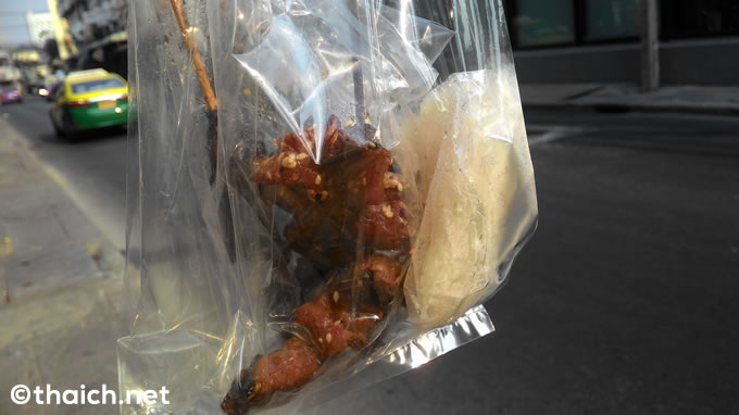 美味しそうな一本10バーツ(約30円)の串焼きを何本かと、一袋5バーツ(約15円)のもち米を買ってお持ち帰り。
