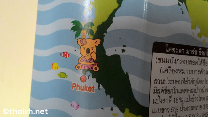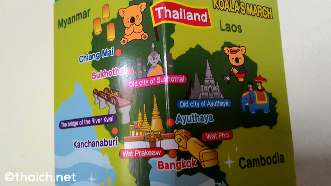 こちらは「コアラのマーチ ファミリーパック」。普通よりもかなり大きなサイズの箱に10袋の「コアラのマーチ」が入っていているのですが、中身よりも箱のパッケージに注目です。なんとタイをモチーフにしたイラストがいっぱい。ゾウさんやトゥクトゥクはもちろん、タイ全土の地図の上にはバンコクのワット・プラケオとワット・ポーを始め、アユタヤの遺跡やチェンマイのイーペン祭りのコムローイなど、各地の名所などが描かれています。これは日本へのお土産にピッタリですね。安くて、軽くて、美味しくて、かわいい!
