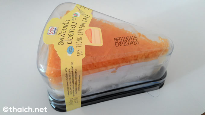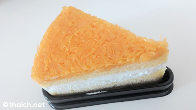 シフォンケーキにタイのお菓子カノムフォーイトーン(ขนมฝอยทอง) が乗った「フォーイトーン・シフォンケーキ(ชิฟฟ่อนเค้กฝอยหอน)」。タイのケーキ屋さんで丸ごと売られているのも時々見ますが、セブンイレブンでカットされたものが一個で売られていたので買ってみました。