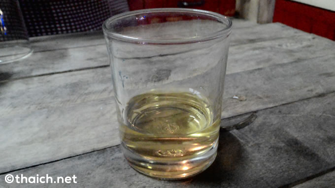 こちらがグラス一杯15バーツ。強い焼酎なので、2,3杯飲めば酔えそうです。このお店では青いマンゴーでしたが、ちょっとした無料おつまみも出るようなので、気になる方はお試しを。