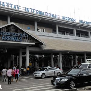 空港ロビー(国際線)から外へ出て、(空港の建物を背にして)左方向へ。さらに右へ折れていくとセタチラト通りに出ます。市街地へ行く車線は、道路を横断した側です。