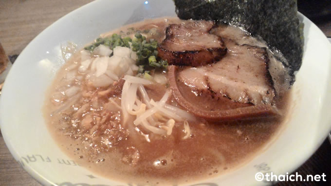 メニューには沢山の種類のラーメンやお酒のおつまみがありましたが、今回食べてみたのが、一番人気だという「醤油豚骨らーめん」です。価格は190バーツ(約570円)。