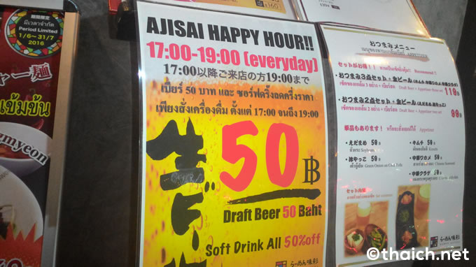 日本人料理店が多く並ぶバンコク・トンロー通りでこの日訪れたのが、ソイ5とソイ7の間にある日本人経営のラーメン屋さん「らーめん味彩」です。時間がちょうどハッピーアワー(17時から19時)で、生ビールが50バーツでの提供中でした。ラッキー!