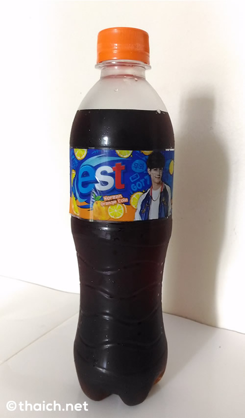 パッケージには韓国の人気男性アイドルグループGOT7のJBさんの写真。どうやらGOT7がestのイメージキャラクターになったらしく、それを記念して発売されたのが「est コリアンオレンジコーラ」のようです。今回買ったのはJBさんのパッケージでしたが、全メンバーのパッケージがあるようなので、ファンは全種類集めたくなりますね。
