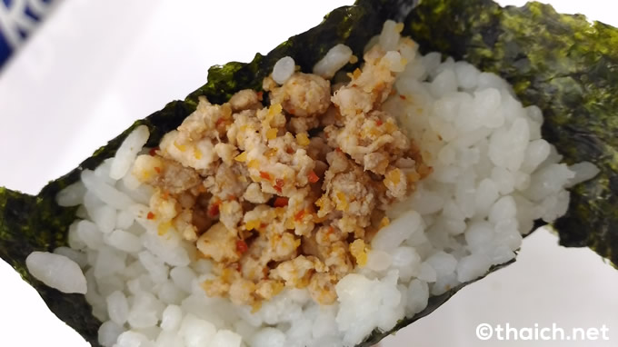 おにぎりを半分に割るとこんな感じ。お米はモチ米でなくもちろん日本米で、タップリとラープムーが入っています。「ラープムーおにぎり」を見つけた方はお試しを!