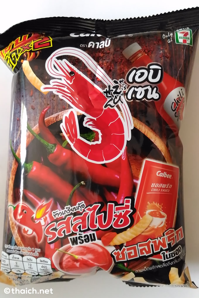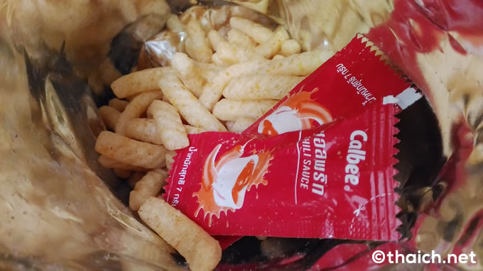 えびせんにはチリパウダーがまぶしてあるようで、これだけ食べてもピリ辛ですが、さらに辛いソースを付けて食べるのがこの商品。ソースのパッケージは激辛な感じですが、中身はタイでよくある甘辛いチリソースです。