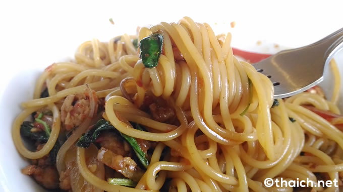 スパゲティの上にたっぷりの豚の挽肉のガパオ。見るからに美味しそうです。それでもこの段階では、それほど期待はしていなかったのですが、一口食べてびっくり。