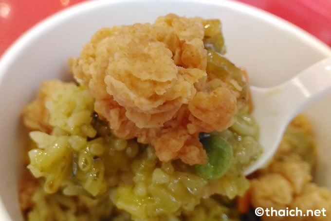 価格は安くてもご飯が隠れるくらい沢山の唐揚げが乗っていますね。ご飯にはほんのり色がついていますのでサフランライスでしょうか?そこにコーン、ニンジン、グリーンピースがトッピングされ、グリーンカレーがかかっています。グリーンカレーはタイ語で言うとゲーンキアオワーン(แกงเขียวหวาน)です。