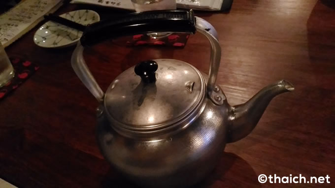 これがヤカンに入った「割り芋焼酎」。焼酎を水で割って数日寝かせて熟成させているそうで、なめらかな口当たりになっています。250MLのSサイズで250バーツ~。