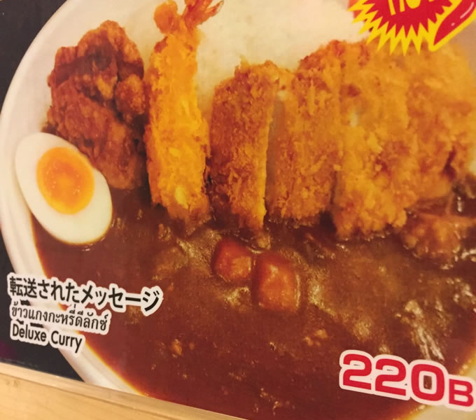 カレーライスもあります。これはカツやフライが乗った220バーツの「デラックスカレー」のメニューですが、商品名が「転送されたメッセージ」になってしまっています(笑)
