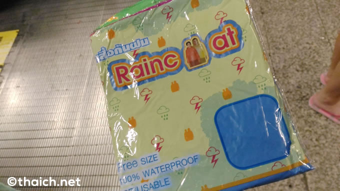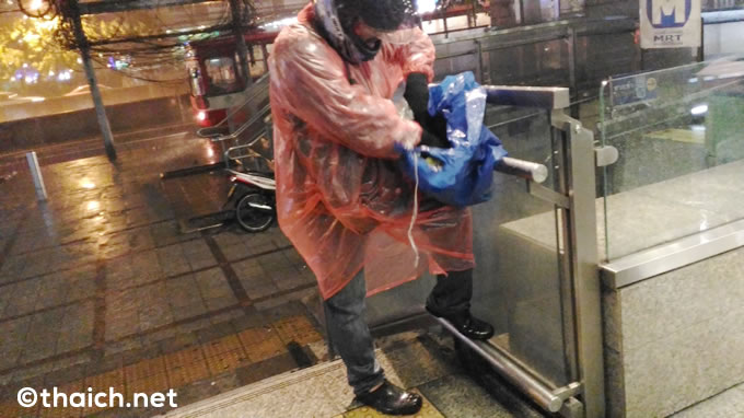 地下鉄から外に出たら大雨。地下鉄駅入口は、雨具がないため動くに動けない人でいっぱいになります。そんな時に登場したのが雨合羽売りのお兄さん。人々は「しばらく止みそうもない」と判断したのか、一つ20バーツ(約60円)の雨合羽はものすごい勢いで次々売れていきます。