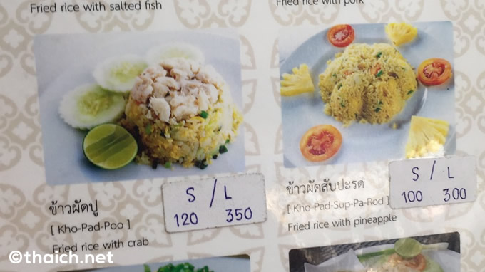 メニューは、いろいろな種類のタイ料理があります。ソムタムなど東北地方(イサーン)の料理や、タイ風スパゲティなんかも注文可能で、まさによりどりみどり。価格も100バーツ台が中心。飲茶は一つ25バーツ、30バーツです。